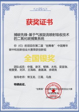 2021级碳中和技术创新班本科生申强带领团队,凭借《捕碳捕碳先锋——基于气液旋流喷射吸收技术的二氧化碳捕集系统》项目从75个决赛项目中突出重围,斩获创新组全国银奖。