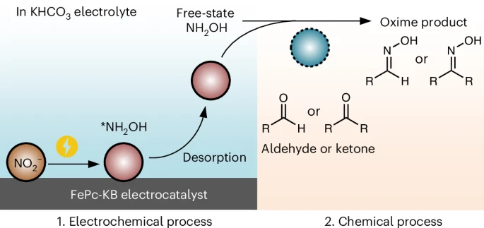 研究团队针对以上问题,首次提出了基于低碳电催化技术的“两步肟化法”策略,将亚硝酸根电还原合成游离态羟胺与醛/酮肟化反应串联,实现了一系列肟类化合物的高效、绿色、通用合成。该策略克服了现有“一步肟化法”(即醛/酮与NOx共进料)中存在的负面效应(如醛/酮底物吸附阻塞位点、醛/酮自身电还原、跨膜扩散)。