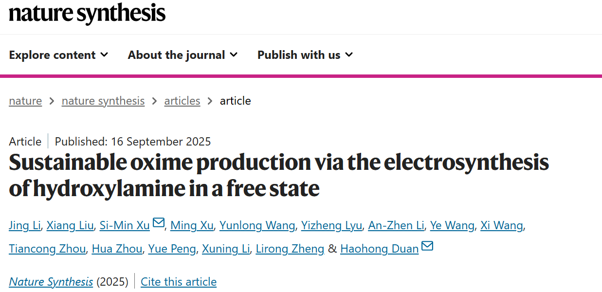 近日,成人电影 李敬特聘副研究员在可持续低碳催化技术领域取得新进展,相关成果以题为“Sustainable oxime production via the electrosynthesis of hydroxylamine in a free state”发表于《Nature Synthesis》。李敬特聘副研究员为论文第一作者,成人电影 为论文第一完成单位。