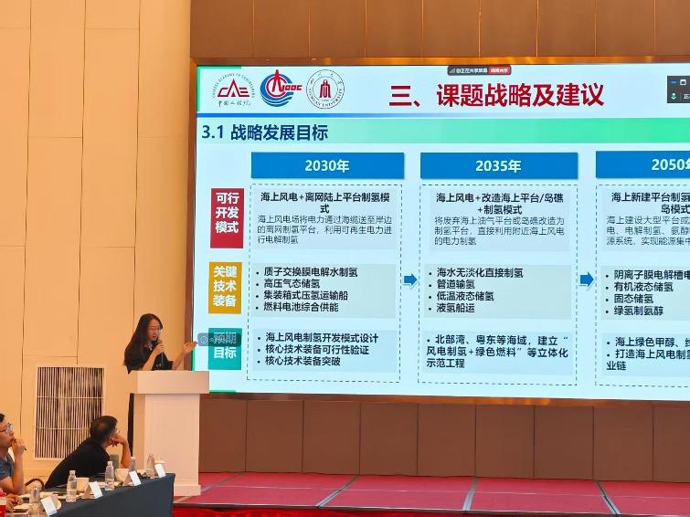 吴霁薇副研究员负责“我国海上浮式风电产业发展战略研究”项目任务五个课题之一“海上浮式风电规模化开发电氢耦合技术及装备研究”。会上,吴霁薇从项目基本情况、主要研究成果和课题战略及建议三个方面介绍了该课题项目研究进展与结题成果。