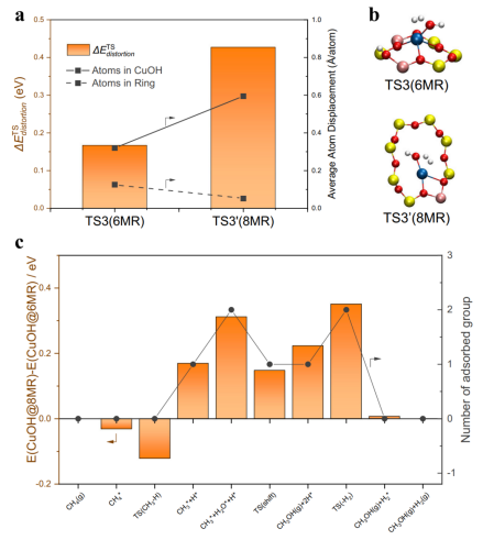 同时,研究者通过DFT理论计算研究发现,6MR限域的单原子Cu位点较高的催化活性主要归因于其较强的限域作用,降低了催化反应决速步骤的活性位结构的形变能。