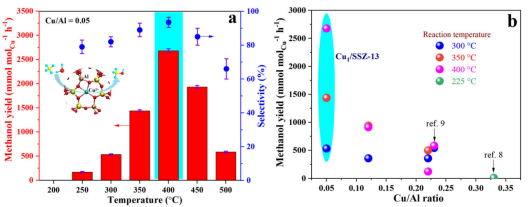 图1. Cu1/SSZ-13催化甲烷-蒸气连续转化合成甲醇的催化活性。
