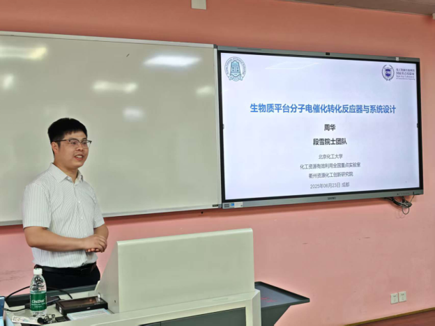 周华以“生物质平台分子电催化转化反应器与系统设计”为题作报告,首先围绕生物质平台分子(包括葡萄糖、甘油、5-羟甲基糠醛)电催化转化的基础研究方面进行了详细讲解。以工艺放大过程中面临的科学/技术问题(如电化学副反应、产物浓度低、传质效率差等)为出发点,深入阐述了高效电催化反应器的设计原则,并展示了团队在千瓦级电解系统构建等方面的研究进展。